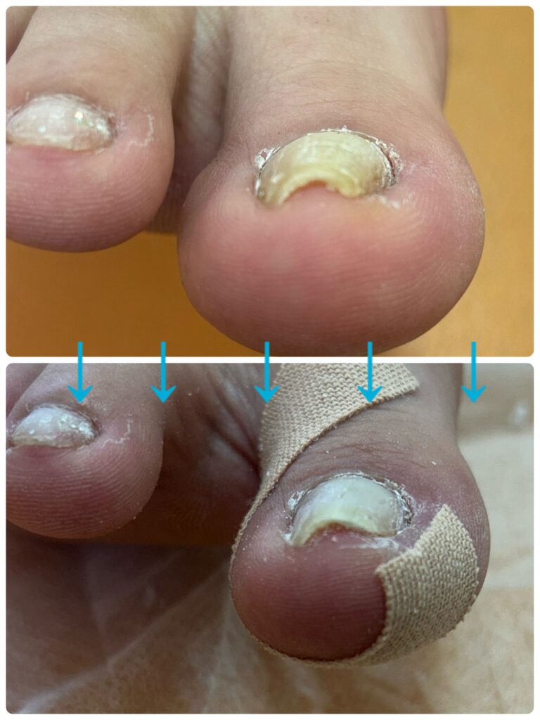 → 初期にテーピングで済ませようとした結果、巻き爪が深く刺さり陥入爪に。
