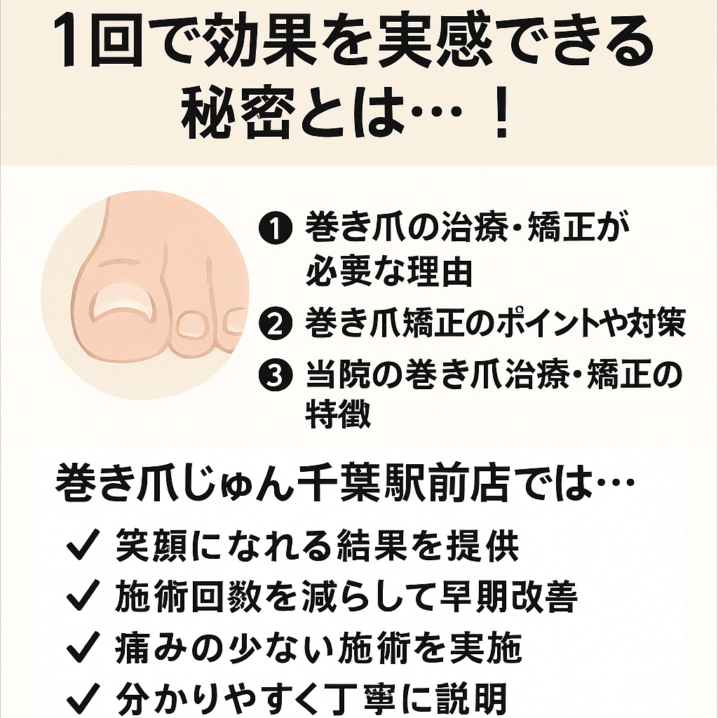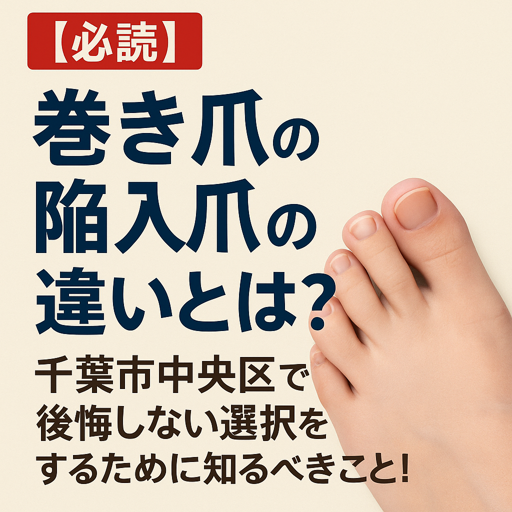 著者:巻き爪じゅん千葉駅前店伊東正之 【】 【】 【】 • 千葉市中央区で「巻き爪・陥入爪」の痛みに悩んでいる方は年々増加傾向にあります。 • 歩くたびに刺さるような痛み、赤く腫れて膿みそうな不安、靴を履くだけでも苦痛……そんな経験をお持ちの方へ、... -