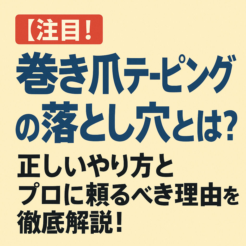 著者:巻き爪じゅん千葉駅前店 伊東正之 【】 【】 【】 • 巻き爪テーピングの役割とは? 巻き爪テーピングは、爪が皮膚に食い込むのを防ぎ、炎症や痛みを一時的に軽減する応急処置です。 • 巻き爪テーピングは“治療”ではない 根本的な矯正にはなりません...