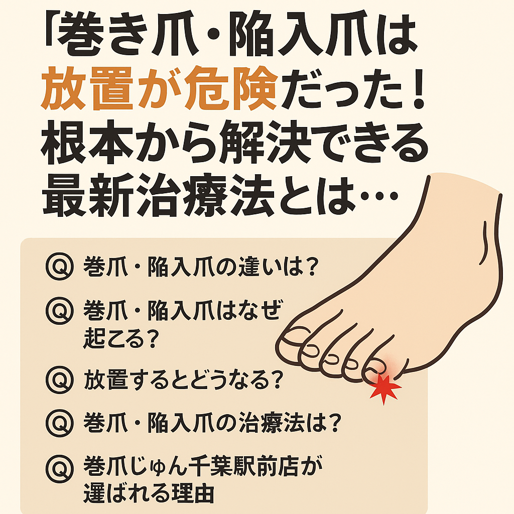 著者:巻き爪じゅん千葉駅前店 伊東正之 【】 【】 【】 • 巻き爪は、爪が横方向に強く湾曲して皮膚を圧迫する状態。特に足の親指に多い。 • 陥入爪は、巻き爪が悪化し爪が皮膚に食い込んで強い痛みや炎症を伴う状態。 • 放置すると化膿や出血を起こし、歩... -