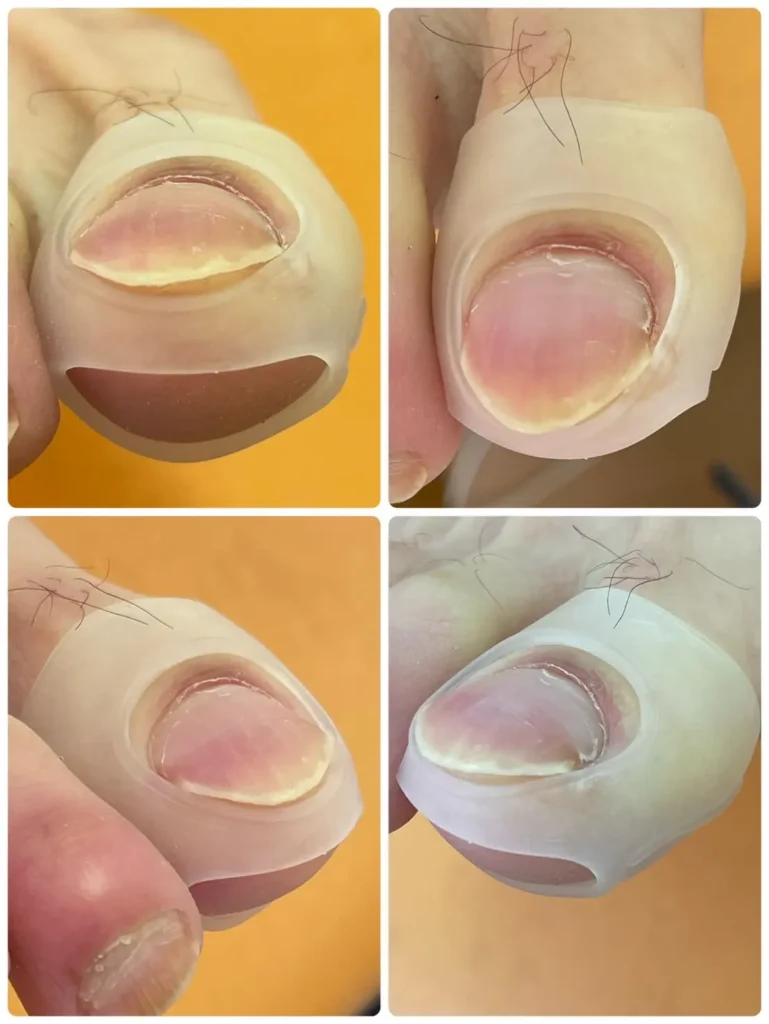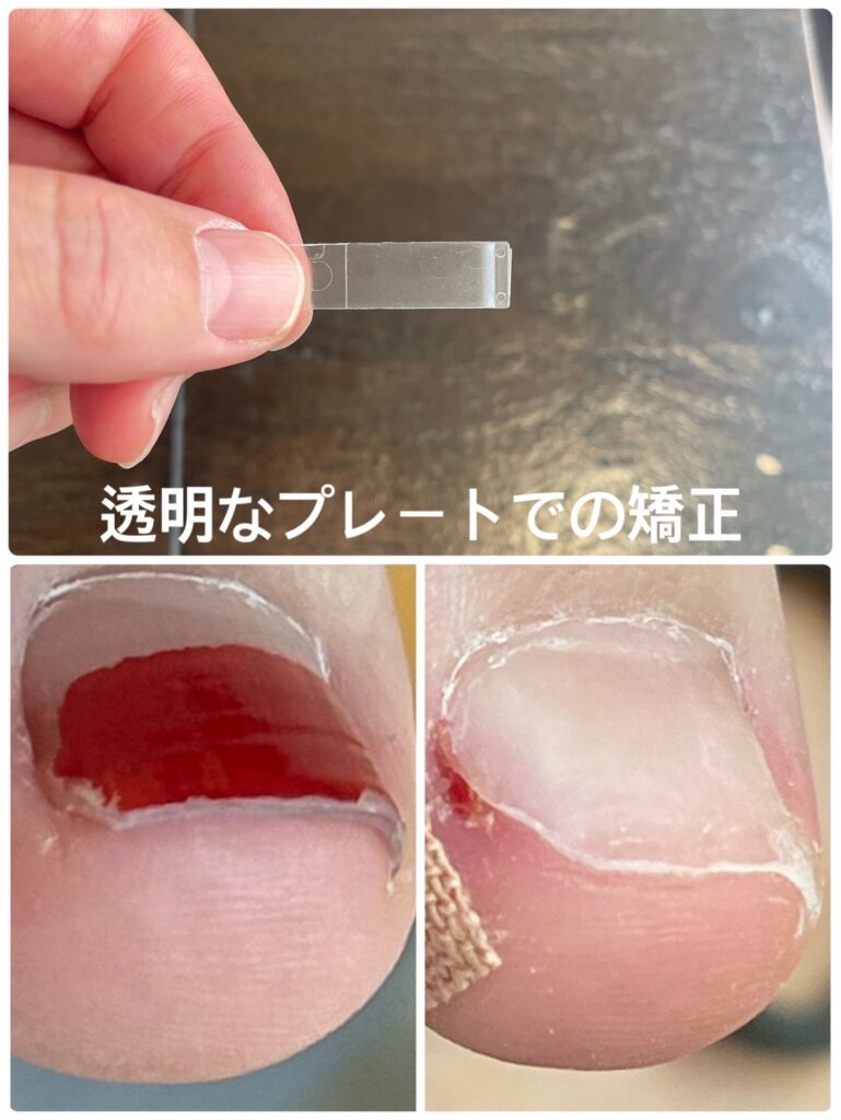 メリットは爪の表面に装着させるので爪の先端だけでなく爪の根元までしっかりと矯正(爪自体を広げる)することが出来ること。透明なプレートの場合裸足でも爪に装着している器具が目立たないこと。