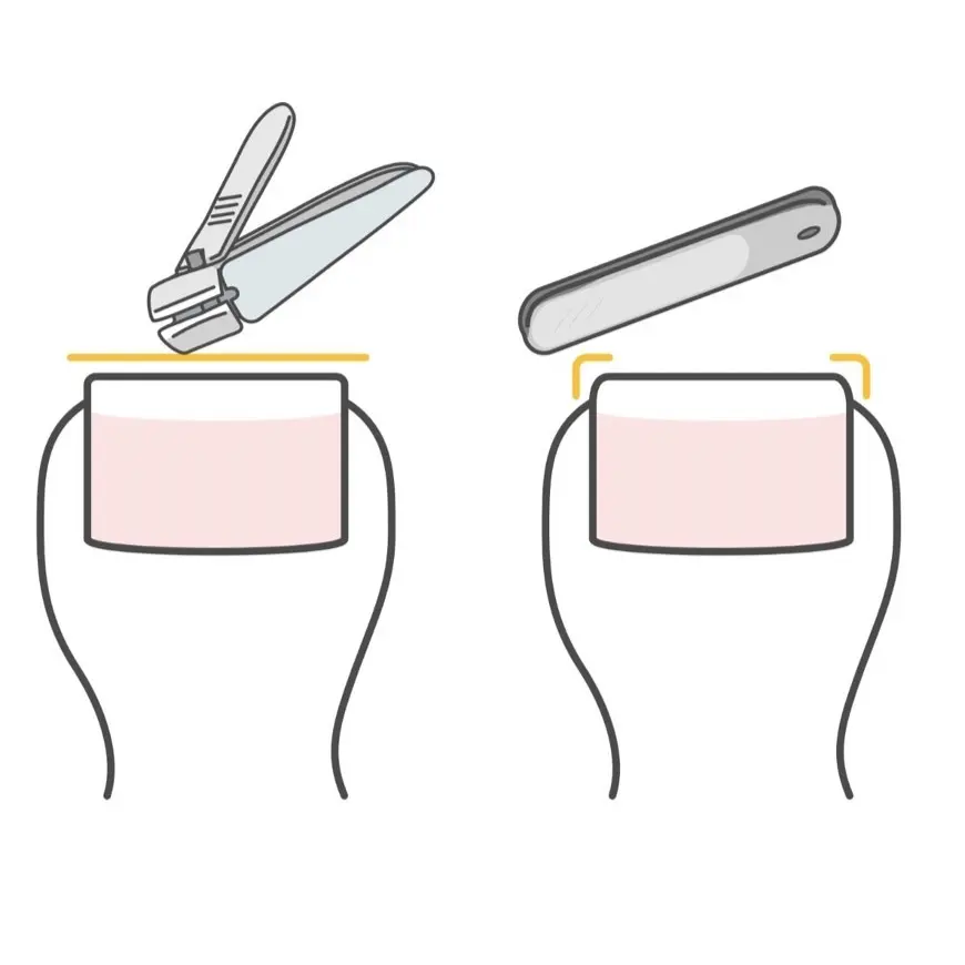 まずは爪の白い部分を1mm程残して一直線に切る。続いて両端の角の部分をヤスリで丸く削る。(角の部分を爪切りで切るとバイアス切りや深爪になりやすいので気をつけましょう)