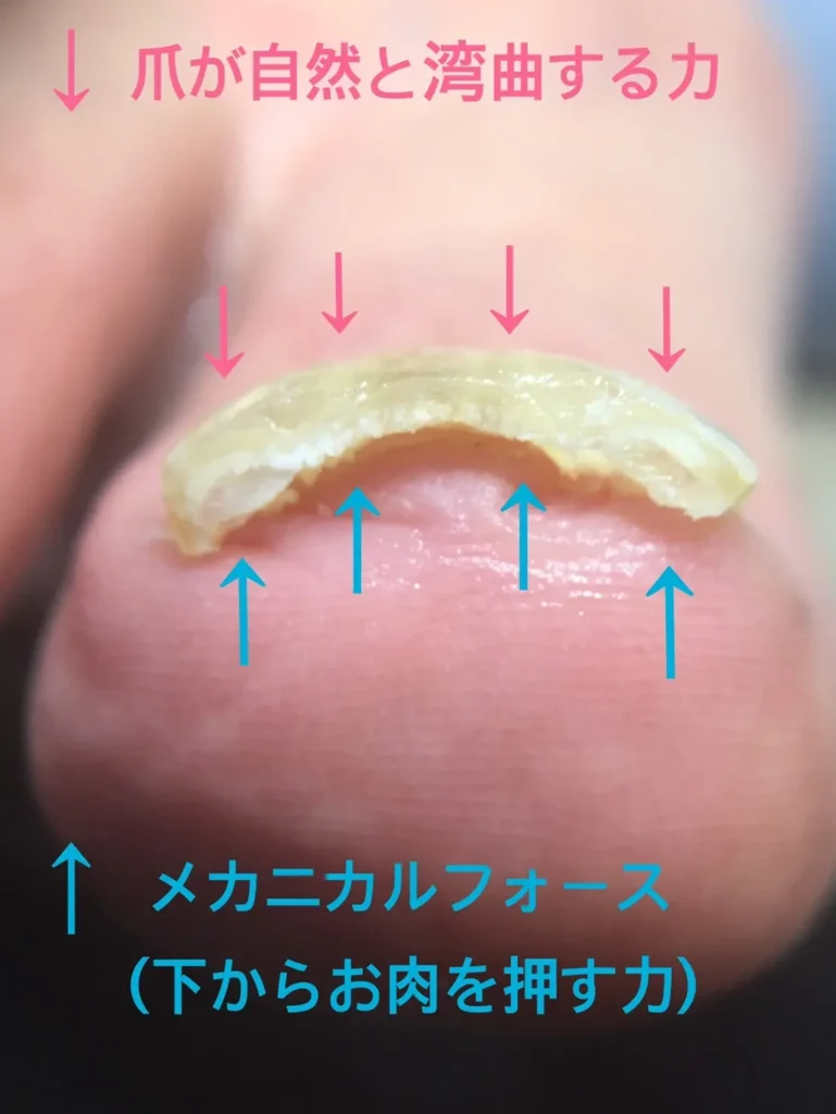 メカニカルフォース(下からお肉を押す力)によって巻き爪を防いでくれる可能性があります。