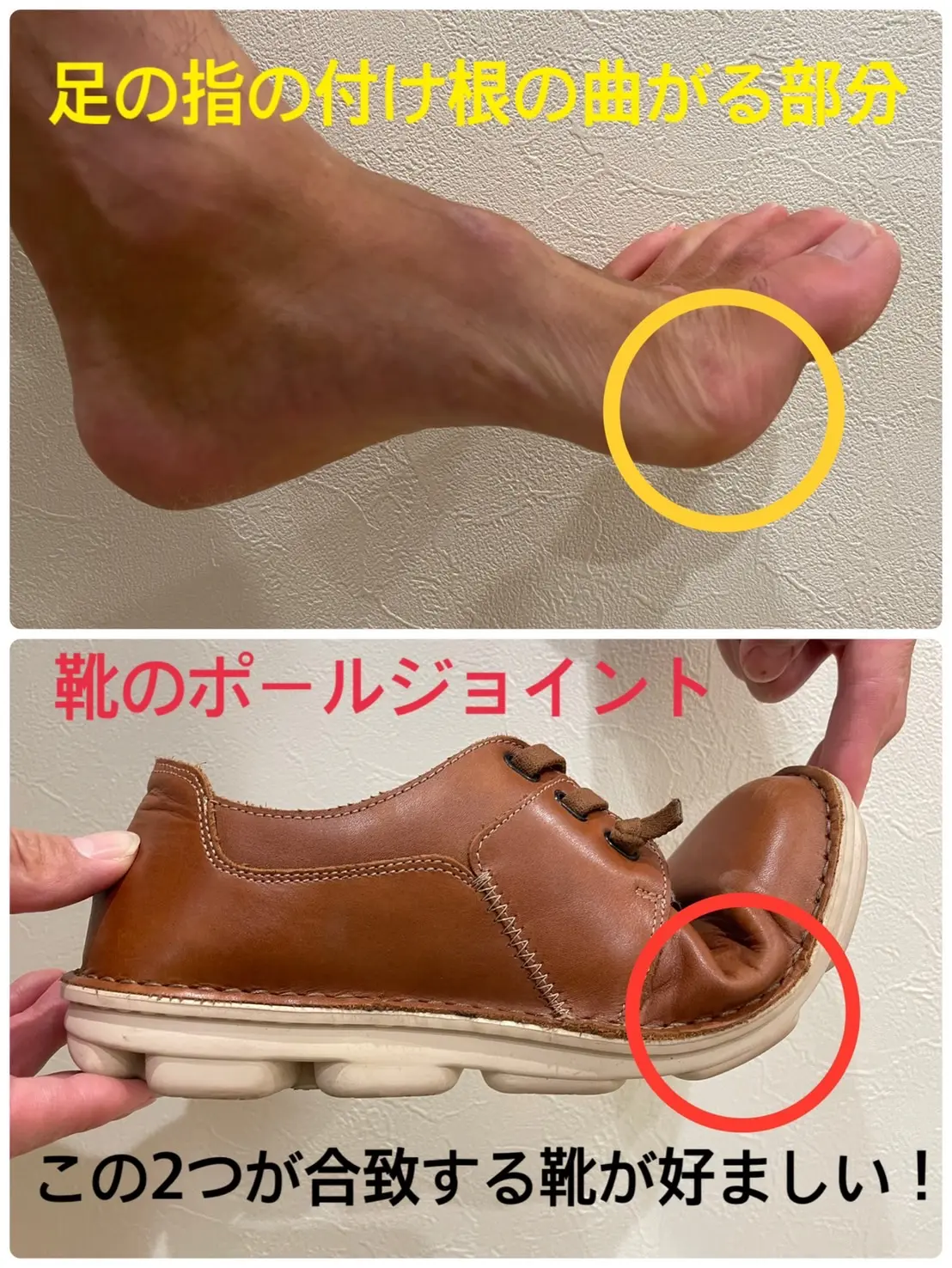 ポールジョイント(靴のつま先の曲がる部分)があり、トゥブレイク(足の指の付け根の曲がる部分)と合っていること